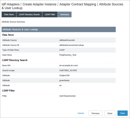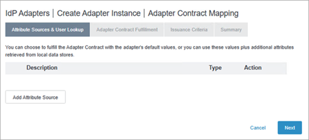En la pestaña Fuentes de atributos y búsqueda de usuarios, seleccione el contrato de adaptador que acaba de crear. Por ejemplo, “attributeSourceId”.