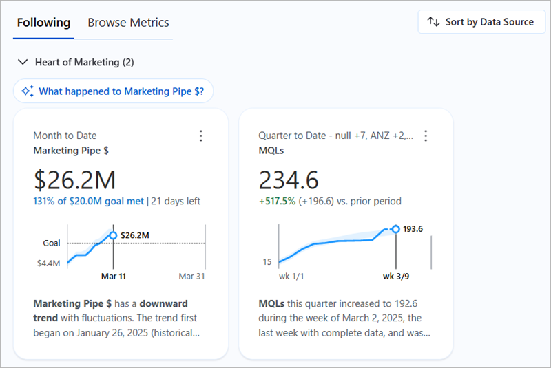 Remarque : Dans la page Découverte, les questions que vous posez ne peuvent filtrer ou comparer que des métriques partageant des attributs clés, tels qu’une granularité temporelle identique ou un ensemble de dimensions communes. Une métrique qui ne correspond pas sera exclue de la réponse.