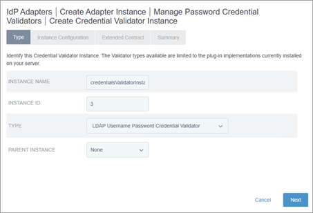 [IdP アダプター マッピング] ページの [アダプター インスタンス] タブで、ステップ 4.1.1 で作成したアダプターを選択し、[次へ] ボタンをクリックします。たとえば、「credentialsValidatorInstance」などです。