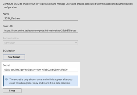 シークレットは、SCIM 設定を作成した Tableau サイト管理者ユーザーにひも付けられています。そのユーザーのサイト ロールが変更になったり、そのユーザーがサイトのメンバーではなくなったりした場合、シークレットは無効になります。この場合、別のサイト管理者が既存の SCIM 構成に対して新しいシークレットを生成して IdP の SCIM 設定に追加するか、あるいは新しい SCIM 構成を作成してベース URL とシークレットを IdP の SCIM 設定に追加することができます。