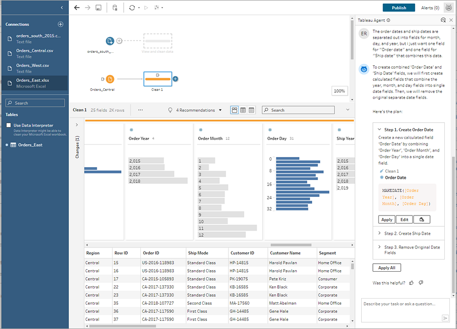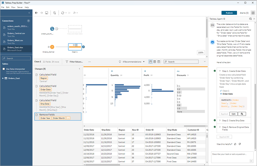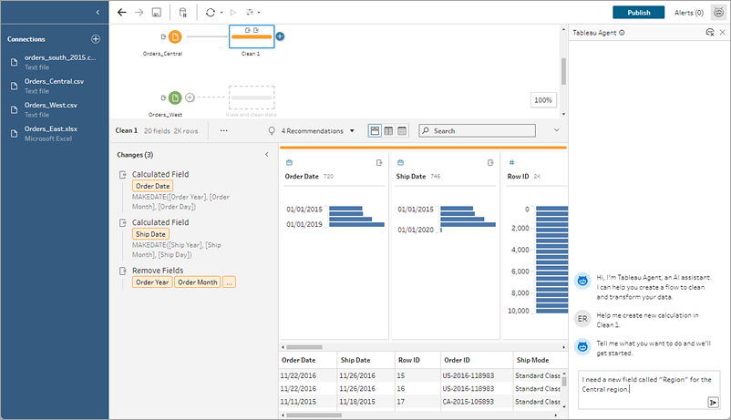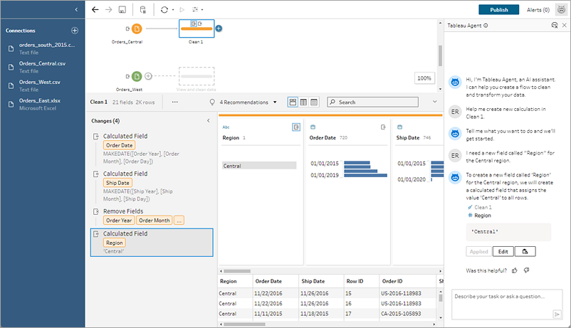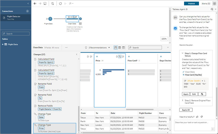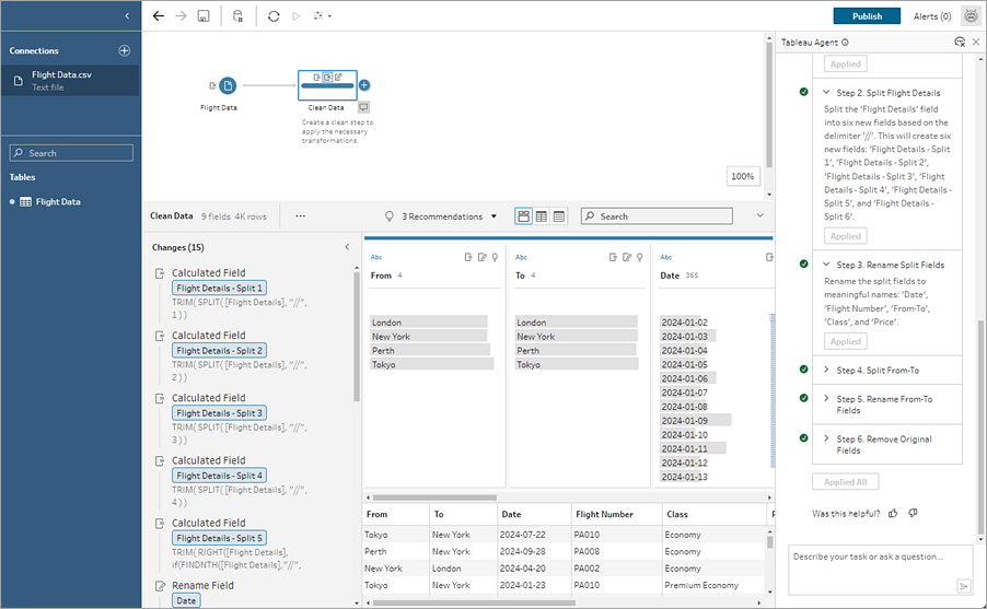 Como la persona encargada, puede revisar los pasos sugeridos y aplicar cada uno individualmente o aplicar todos los pasos del plan. Tableau Agent realiza los pasos por usted, creando su flujo y agregando los cambios al panel Cambios. Puede interactuar manualmente con cualquier cambio que realice Tableau Agent, como editar un cálculo o usar Deshacer o Rehacer, para que siempre tenga el control de su flujo.