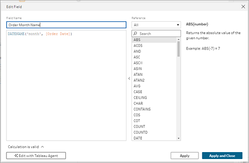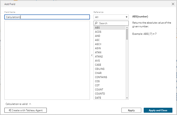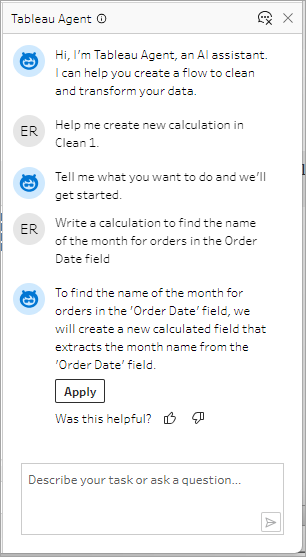 Nota: A partir de la versión 2025.2, cuando le pida ayuda a Tableau Agent con un cálculo, se abrirá un panel de conversación para que haga preguntas en lugar de permitirle hacer preguntas directamente en el cuadro de diálogo Cálculo.