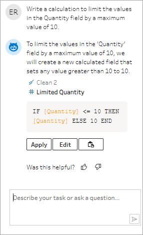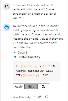 Evalúe el resultado para asegurarse de que sea lo que desea. Haga clic en Editar para abrir el cuadro de diálogo de cálculo y personalizar el cálculo manualmente y aplicarlo, o haga clic en Aplicar y Tableau Agent agregará el cálculo a su flujo.