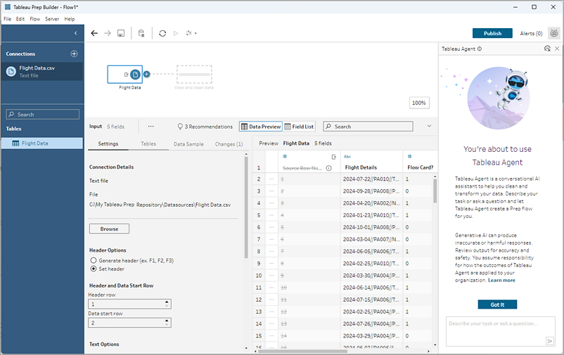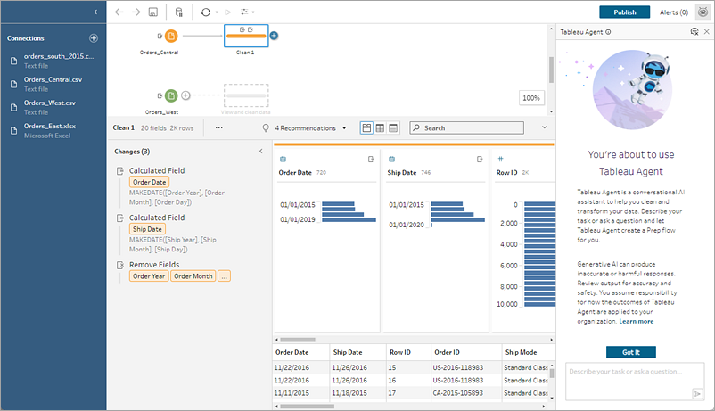 Tableau Agent en Tableau Prep es una funcionalidad de IA generativa que puede ayudarle a limpiar y transformar sus datos. En versiones anteriores, podía usar Tableau Agent para crear campos calculados a medida que construía su flujo. A partir de la versión 2025.2, puede usar Tableau Agent para limpiar sus datos y construir su flujo, así como obtener ayuda para crear campos calculados. Esta funcionalidad está disponible en Tableau Prep Builder y Creación web de Tableau Prep en Tableau Cloud y Tableau Server (versión 2025.3 o posteriores).