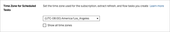 This setting determines the time zone used for scheduled tasks you create. It applies to custom schedules for subscriptions, extract refreshes and flow tasks.