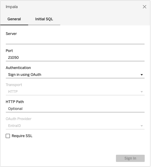 Starting in Tableau 2025.3 for Tableau Desktop and Tableau Server, and 2026.1 for Tableau Cloud, you can use OAuth 2.0/OIDC to federate identity from an external identity provider to Impala.