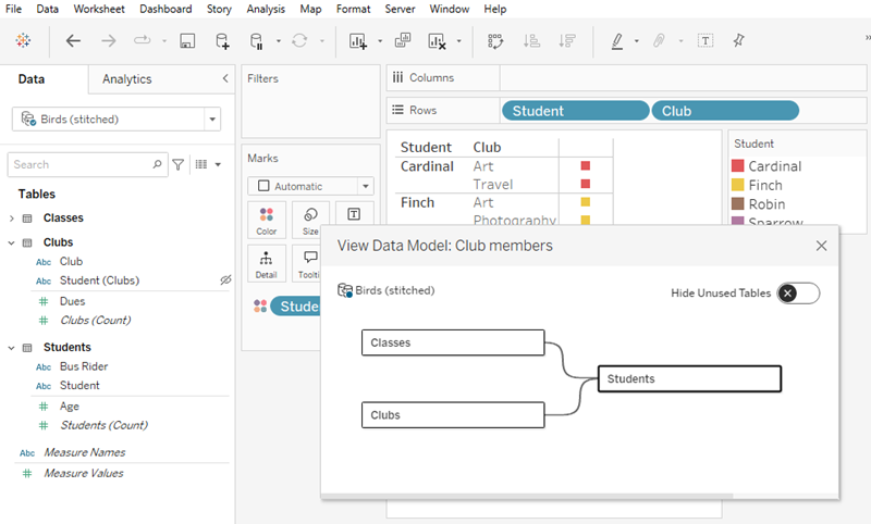 Se l’opzione Nascondi tabelle inutilizzate è attivata, l’aggiunta o la rimozione di campi nella visualizzazione comporterà l’aggiornamento automatico del diagramma Visualizza modello di dati. Questo può essere particolarmente utile per comprendere la correlazione a livello di campo nelle origini di dati con più tabelle di base(Il collegamento viene aperto in una nuova finestra).