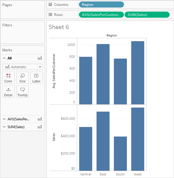 Com o LOD na divisória Linhas, agregado como AVG, e dimensão [Region (Região)] na divisória Colunas, a exibição mostra o volume médio de vendas ao cliente por região: