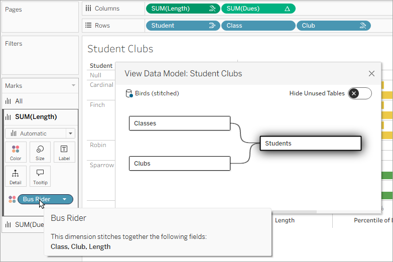 通过“查看数据模型”’,您可以在可视化项上下文中查看数据源的结构。您无需在可视化项和数据源选项卡之间来回切换来验证表之间的关系,只需在工作表标签上打开对话框即可。与计算编辑器一样,此对话框允许您在可视化项打开的情况下与之进行交互。