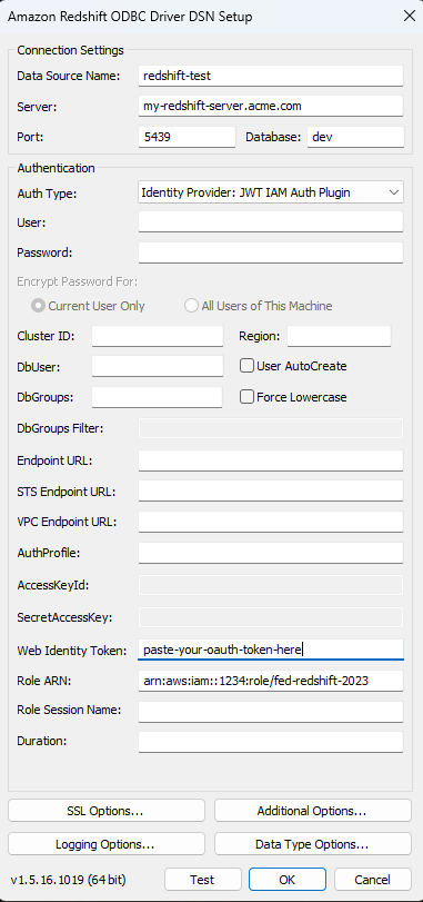 참고: 테스트 시 DSN의 연결 문자열에 DbUser 또는 DbGroups를 지정하지 마십시오. Tableau는 이러한 항목에 액세스할 수 없으며 이들을 연결 문자열에 포함할 수 없습니다. 이들을 토큰 클레임에는 포함할 수 있습니다.