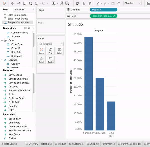 - ลากการวัดผลเดิม (เช่น ยอดขาย) กลับไปที่แถบแถว แล้วจึงลากการคำนวณใหม่ (เช่น ผลรวมของยอดขาย) ไปยังเคล็ดลับเครื่องมือ การแสดงเป็นภาพของคุณอาจยังคงเหมือนเดิม แต่ตอนนี้คุณมีสิทธิ์เข้าถึงการวัดผลใหม่