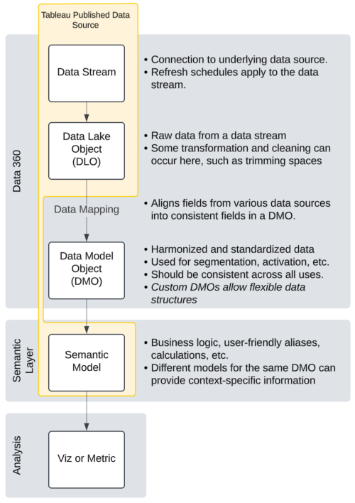 Un DMO n’a pas d’équivalent direct dans Tableau. Un DMO peut être mappé à partir de plusieurs DLO (comme une « vue » dans une base de données) et chaque DMO est une table unique.