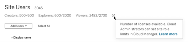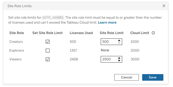 Note: The site role limit must be equal to or greater than the number of licenses used and can’t exceed the cloud limit for that site role.