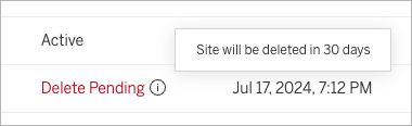 After a site is scheduled for deletion, it reflects a "Delete Pending" status and is removed from the Sites page in Cloud Manager upon deletion. To view the remaining days before deletion, hover over the information icon in the Status column.