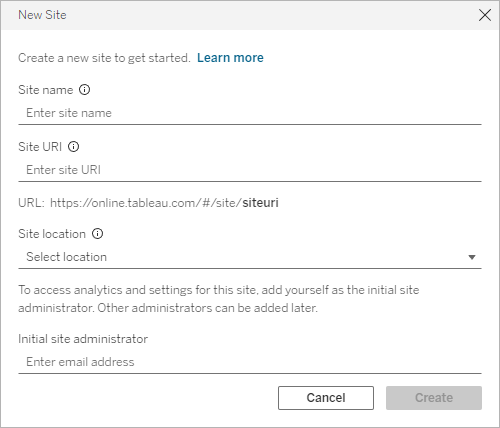 Site name: A name for the Tableau Cloud site. The site name can be the name of your organization or for a specific team, such as Sales or Marketing. Providing a descriptive name allows users to quickly understand the intended purpose of the site.