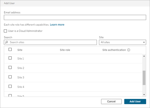Site role: Assign the user a site role on each selected site. For more information about site roles and capabilities, see Set Users’ Site Roles.