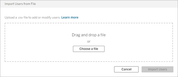 Important: Importing a CSV file with different site roles automatically updates existing users to the roles specified, even if they’re more restrictive. This change affects all users, including cloud administrators.