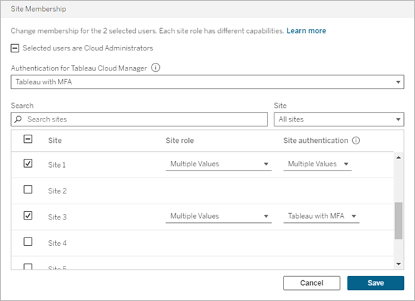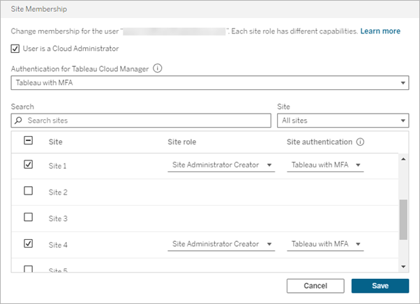 Site membership refers to the sites and roles assigned to each user in a tenant. Cloud administrators can modify a user’s site membership at any time, such as granting access to additional sites or changing their designated site role and authentication. All changes to users are performed in the site membership dialog and then shared across sites.