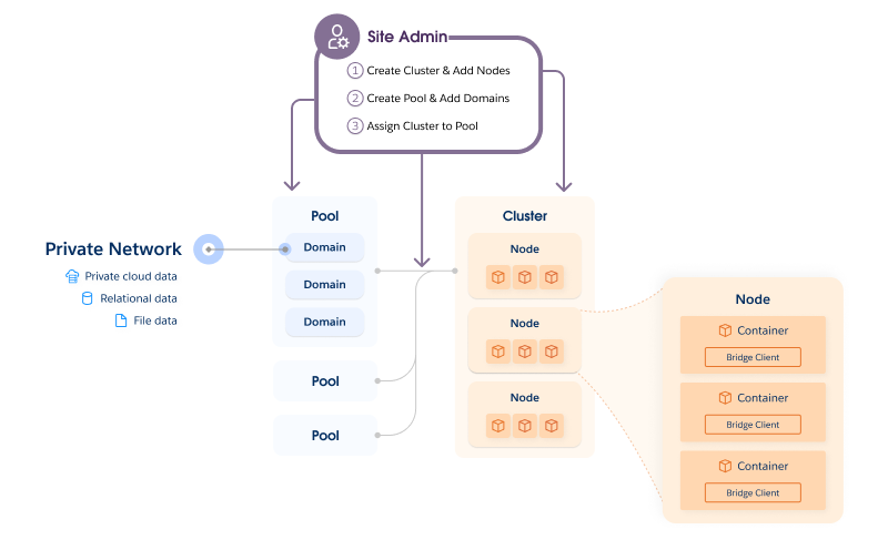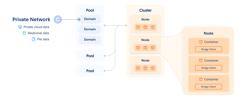 In your environment, the Data Connect Kubernetes cluster oversees a set of containers. The containers support the runtime environment that consists of one or more Bridge clients. The Bridge client is the program that runs tasks and enables secure communication across the firewall between your organization.