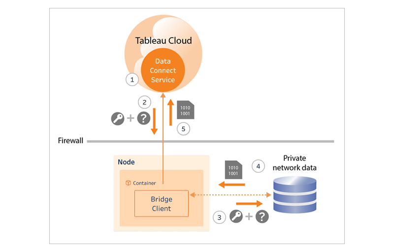 Queries are managed from the Bridge client in the cluster. Your data is transmitted directly from the Bridge client to Tableau Cloud. Data Connect doesn’t require external network access, firewall holes, or remote machine access.