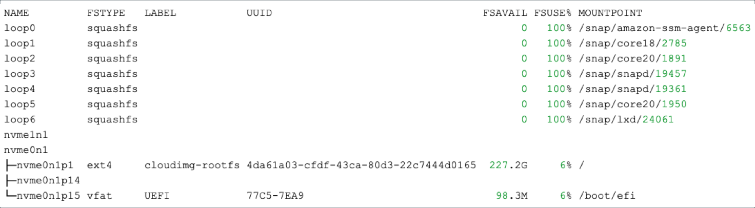 The following image shows an example where the extra volume nvme1n1 on a cluster node is unformatted and the FSTYPE is empty: