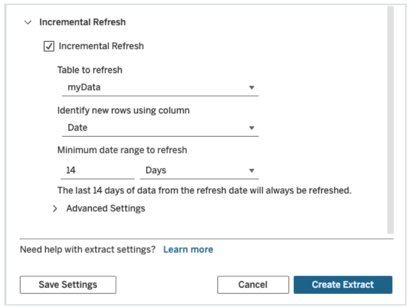 Advanced Settings allow you to either replace the last rows added by refreshing values equal to or greater than the last recorded value, or retain the last rows added by only refreshing the extract with values greater than the last recorded value.