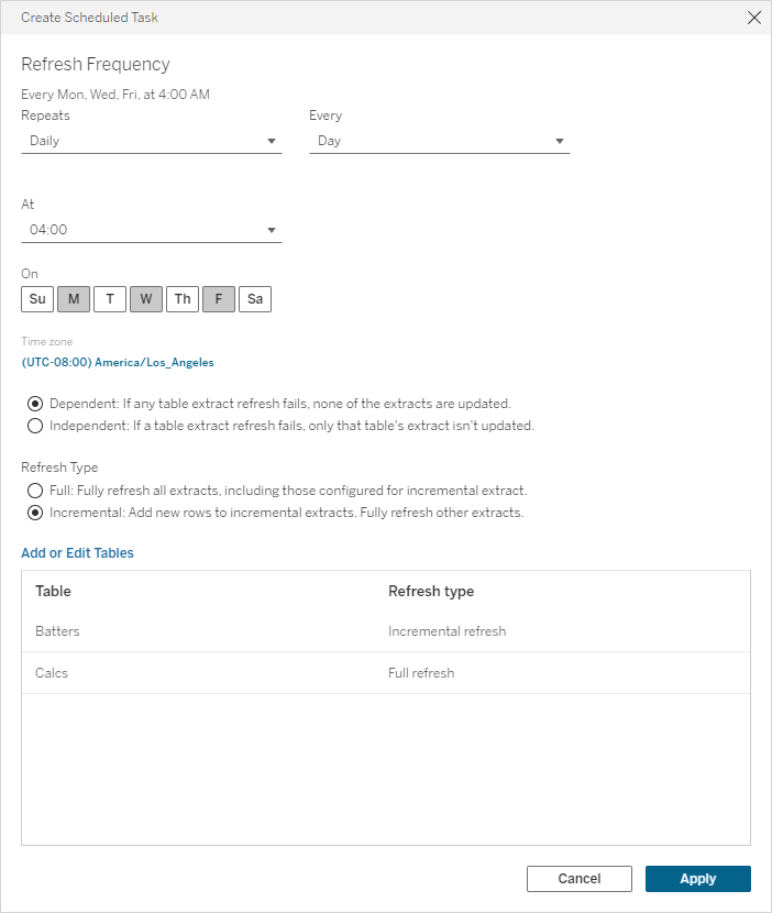 • Dependent means that none of the extracts will be updated if one or more tables' extract refresh jobs fails.