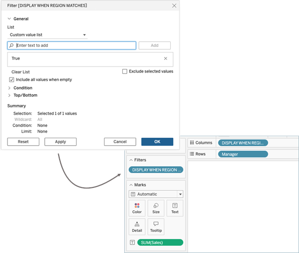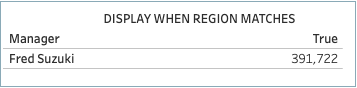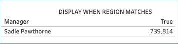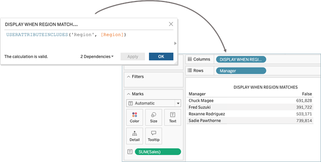 Continuing the example introduced in Step 2: Include user attribute claims in the JWT above, to pass the “Region” user attribute claim to a workbook, the author can include USERATTRIBUTEINCLUDES. For example, USERATTRIBUTEINCLUDES('Region', [Region]), where ‘Region’ is the user attribute and [Region] is a column in the data. Using the new calculation, the author can create a table with Manager and Sales data. When the calculation is added, the workbook returns “False” values as expected.