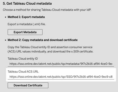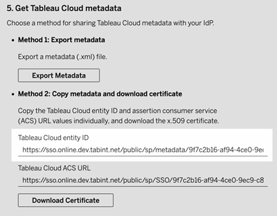 For Tableau Cloud, the procedure in this section will use the information from 5. Get Tableau Cloud Metadata, under Method 2: Copy metadata and download certificate on the New Configuration page in Tableau Cloud. For TCM, the procedure in this section will use the information from 4. Get Tableau Cloud Metadata, under Method 2: Copy metadata and download certificate on the Authentication page in TCM.