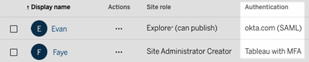 In Tableau Cloud, on the Users page, you can see whether a user is authorized for SAML authentication.