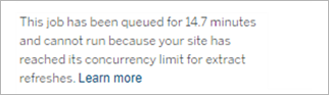 • Pending: This job is currently Pending, but is running late. Tableau keeps track of the average queue times for the same job, and if the current queue time is longer than the average queue time then it is considered running late. Times for how much longer than average the job has been queued is provided in the tooltip that is displayed when you hover over the status.