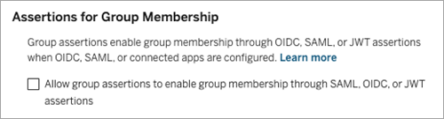 Under Assertions for Group Membership heading, select the Allow group assertions to enable group membership through SAML, OIDC, or JWT assertions check box.
