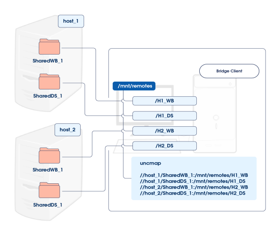 2. On the host computer where you are running the Bridge client, mount the remote share on the local file system. For example, /mnt/remotes/H1_WB.