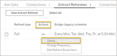The schedule you use can depend on a couple of factors, including the version the original schedule was created and the type of underlying data that the data source connects to. In summary, Bridge refresh schedules are designed to leave client management tasks to the site admin and enable you to perform all your data source management tasks directly on Tableau Cloud.