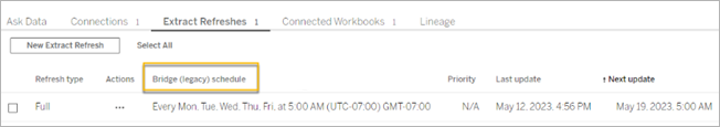 - In the legacy schedule, go to the published data source and click the Extract Refreshes tab to display the Bridge (legacy) schedule.