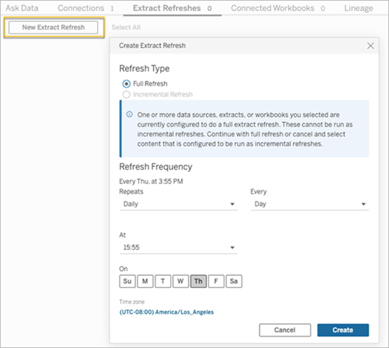 In the Create Extract Refresh dialog box, configure a schedule for the refresh. For more information about how to configure the schedule, see Schedule Refreshes on Tableau Cloud.